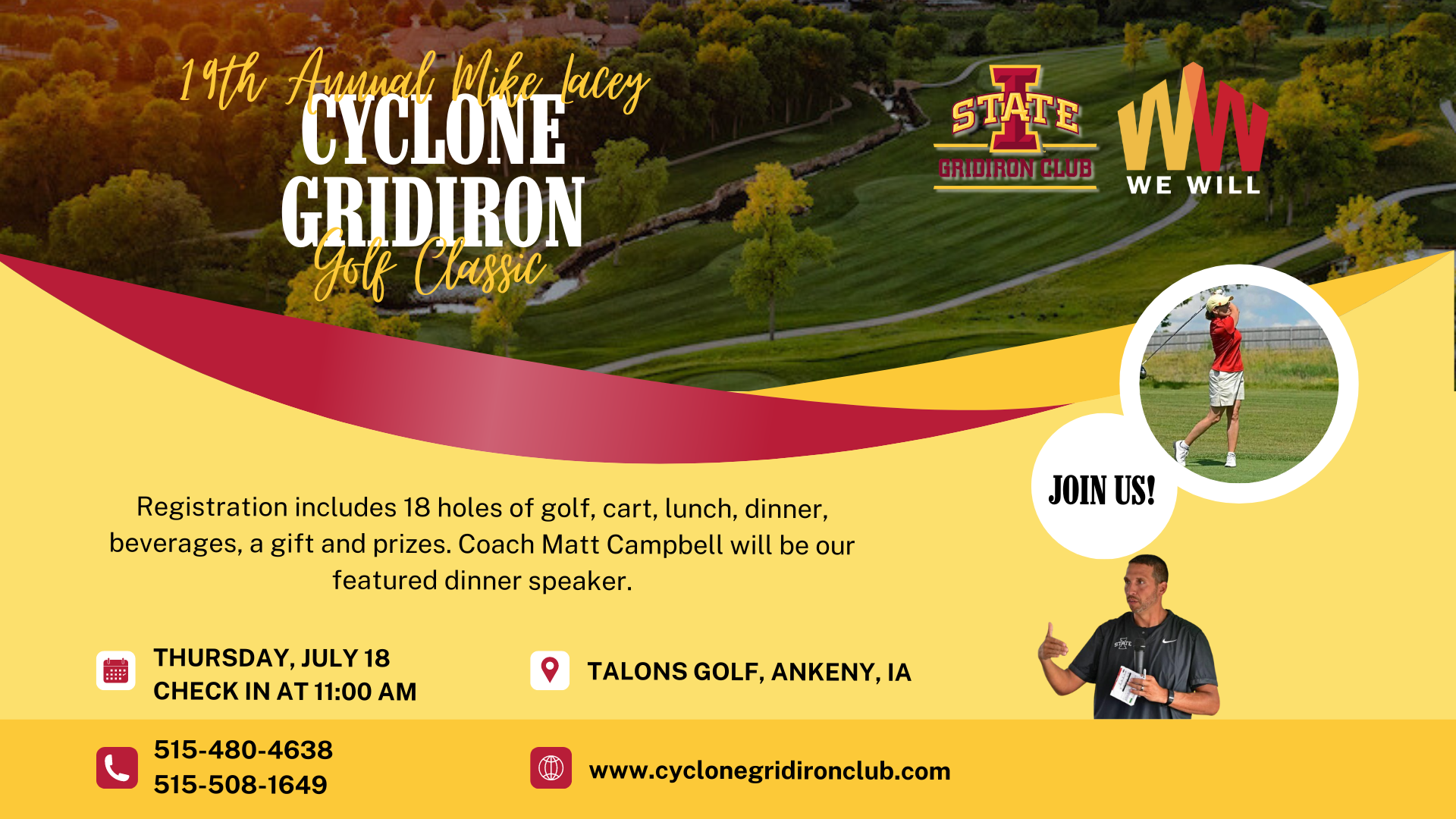 Mike Lacey Cyclone Gridiron Golf Classic Thursday, July 18, 2024 11:00 AM 8:00 PM Talons Golf 1505 NE 36th Street Ankeny, Iowa 50021 (map) Google Calendar ICS