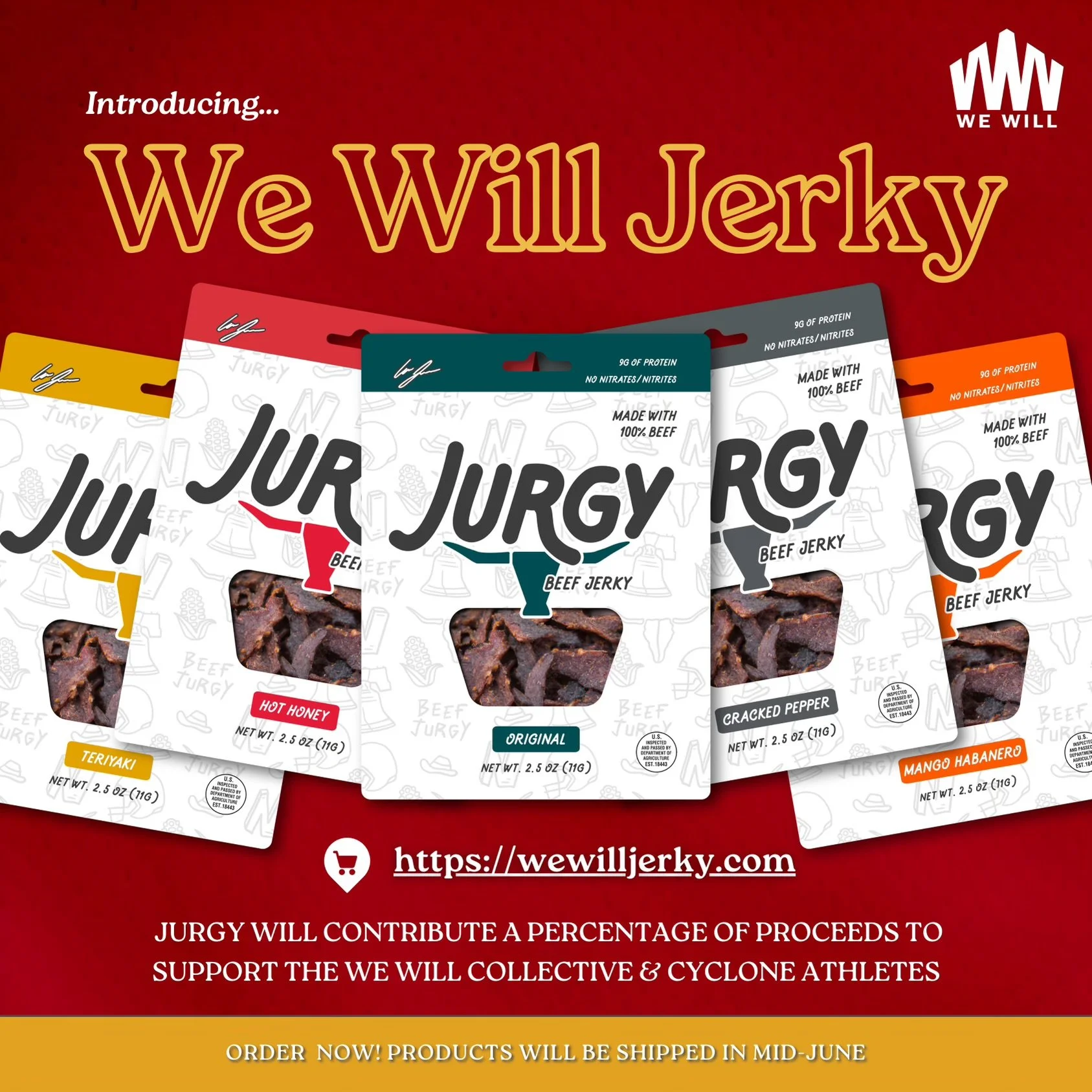 Jurgy - All-American Beef Jerky. Proceeds from each purchase directly support the We Will Collective and Cyclones athletes. This partnership signifies strong unity between past, current, and future Cyclones.
